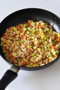 (6)加入鸡肉丁翻炒至变色;